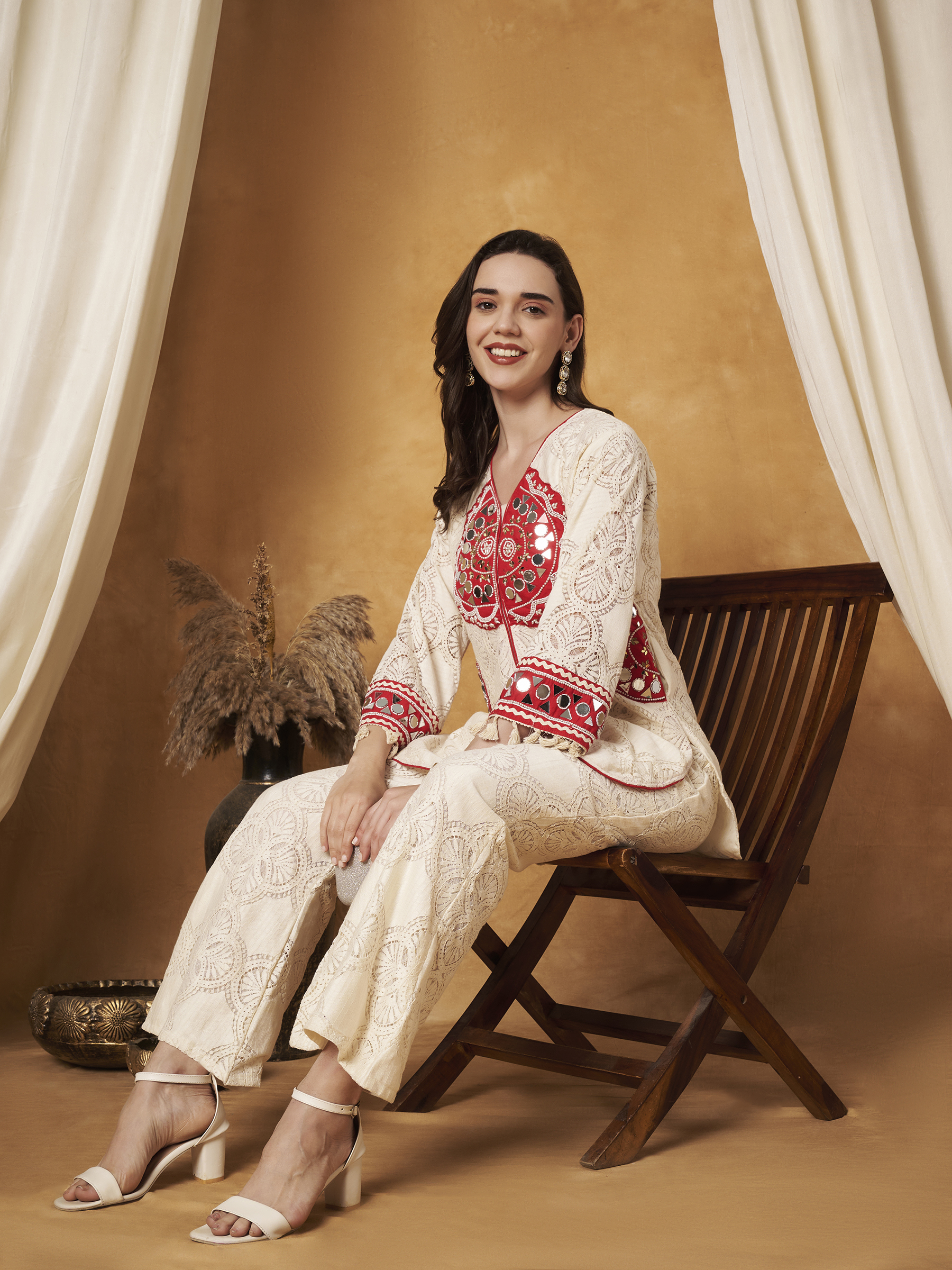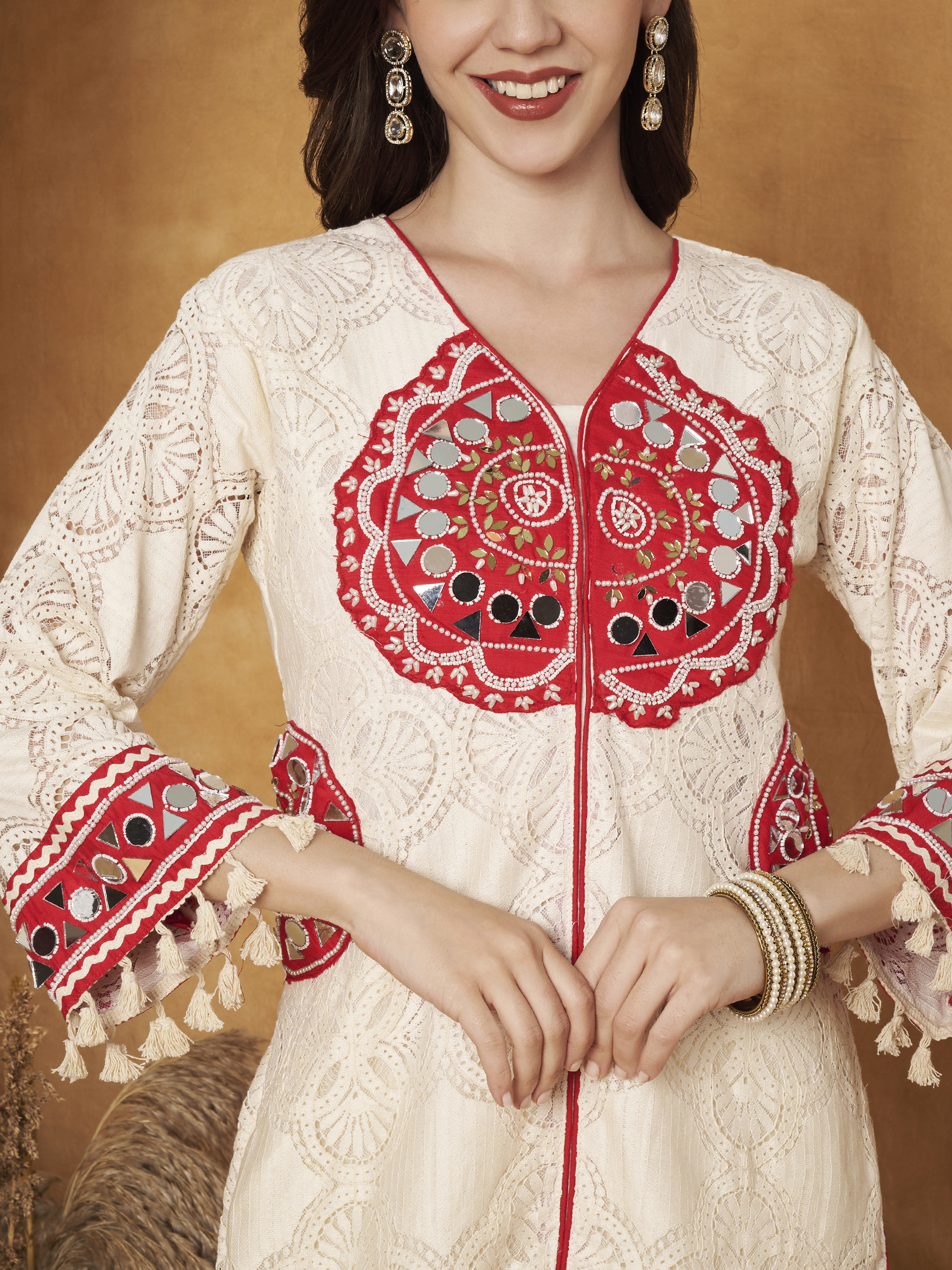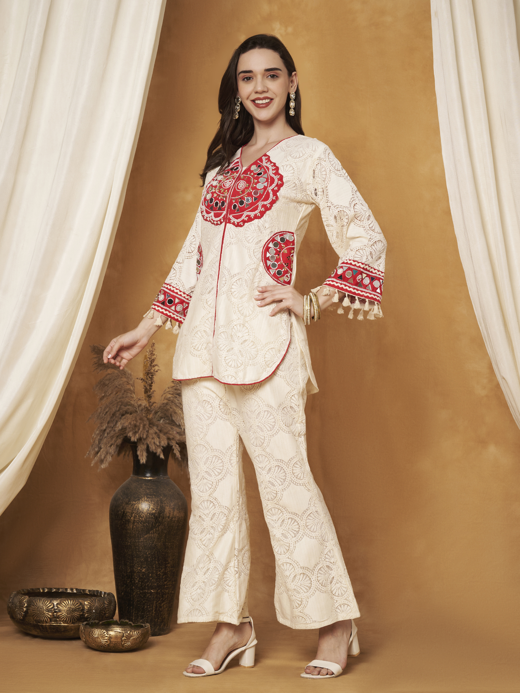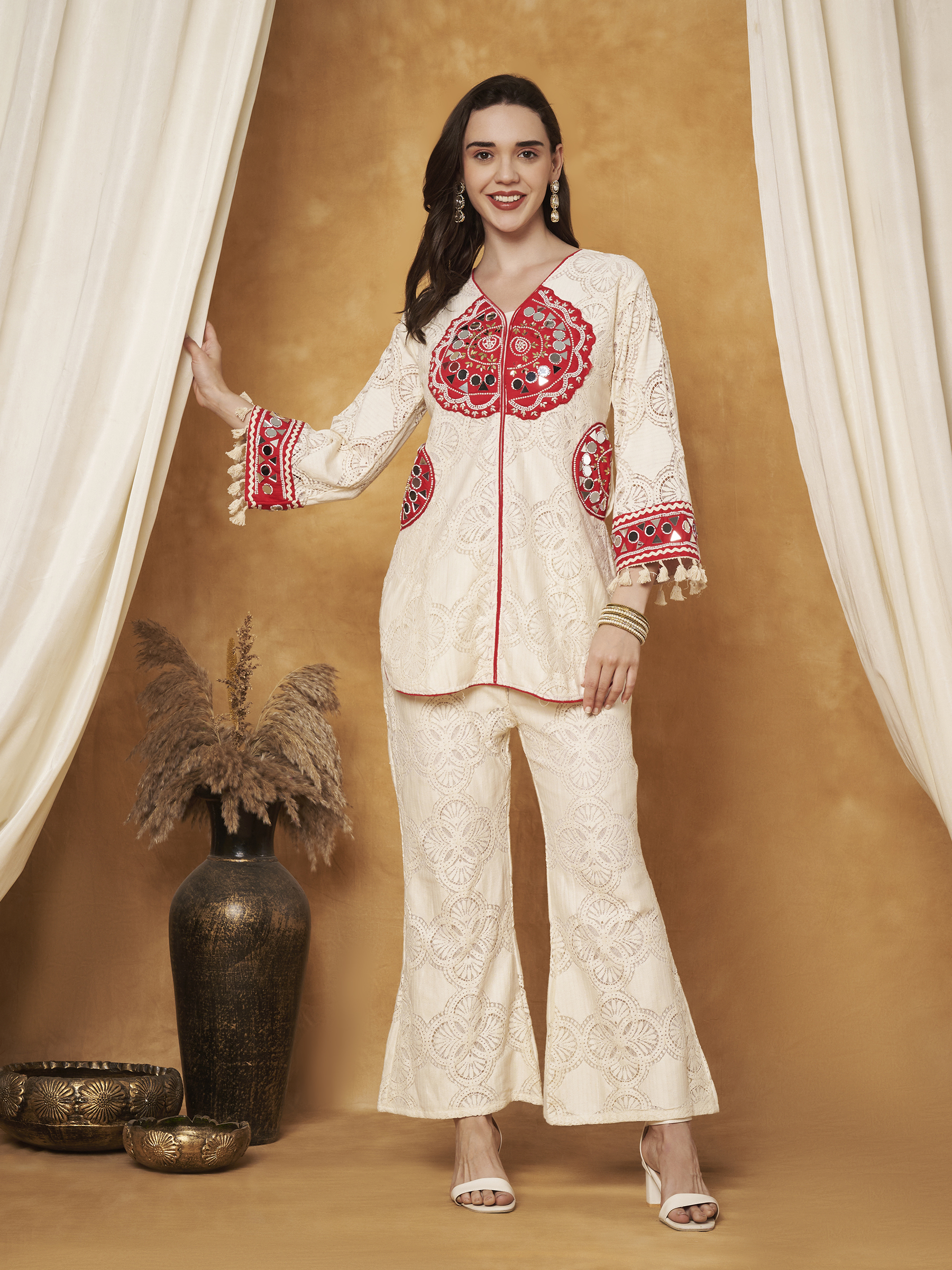 CREAM CROCHET CO-ORD SET WITH BEAUTIFUL MIRROR AND PEARL WORK ON THE NECKLINE AND POCKETS. THE TOP AND BOTTOM BOTH COME WITH ATTACHED LINING FOR COMFORT AND A NEAT FINISH. TASSELS ON THE SLEEVES ADD A PLAYFUL TOUCH, WHILE THE BELL-BOTTOM SILHOUETTE GIVES IT A STYLISH VINTAGE DESIGNER LOOK. ELEGANT, COMFORTABLE, AND PERFECT FOR FESTIVE OR STATEMENT WEAR.